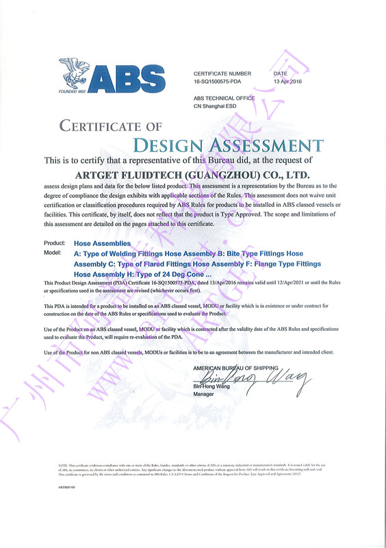 廣州市阿蓋特科技ARTGET軟管總成、接頭美國船級(jí)社ABS型式認(rèn)可證書,ABS船級(jí)社產(chǎn)品認(rèn)證。