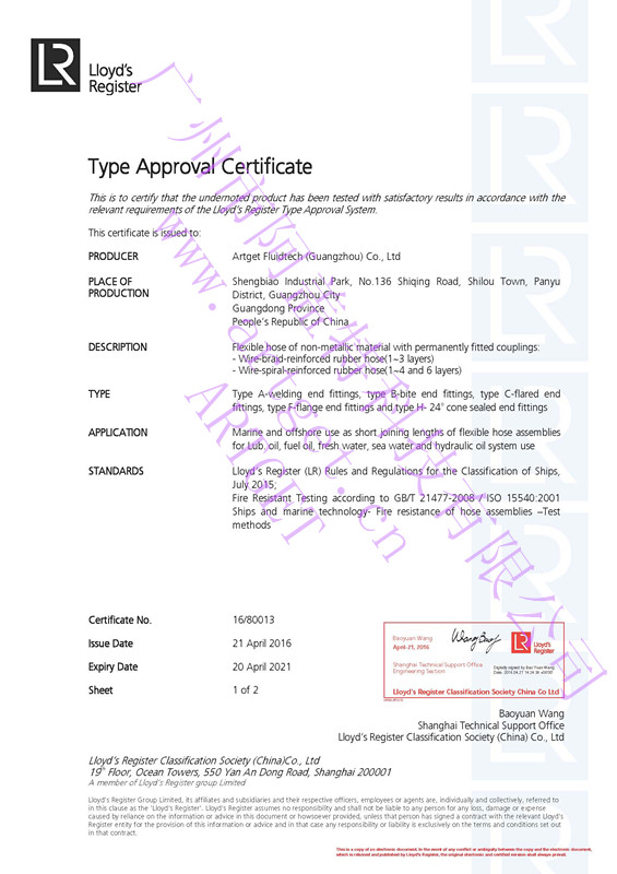 廣州市阿蓋特科技有限公司生產的膠管總成通過英國船級社勞氏LR型式認可證書,并可以做LR產品認證